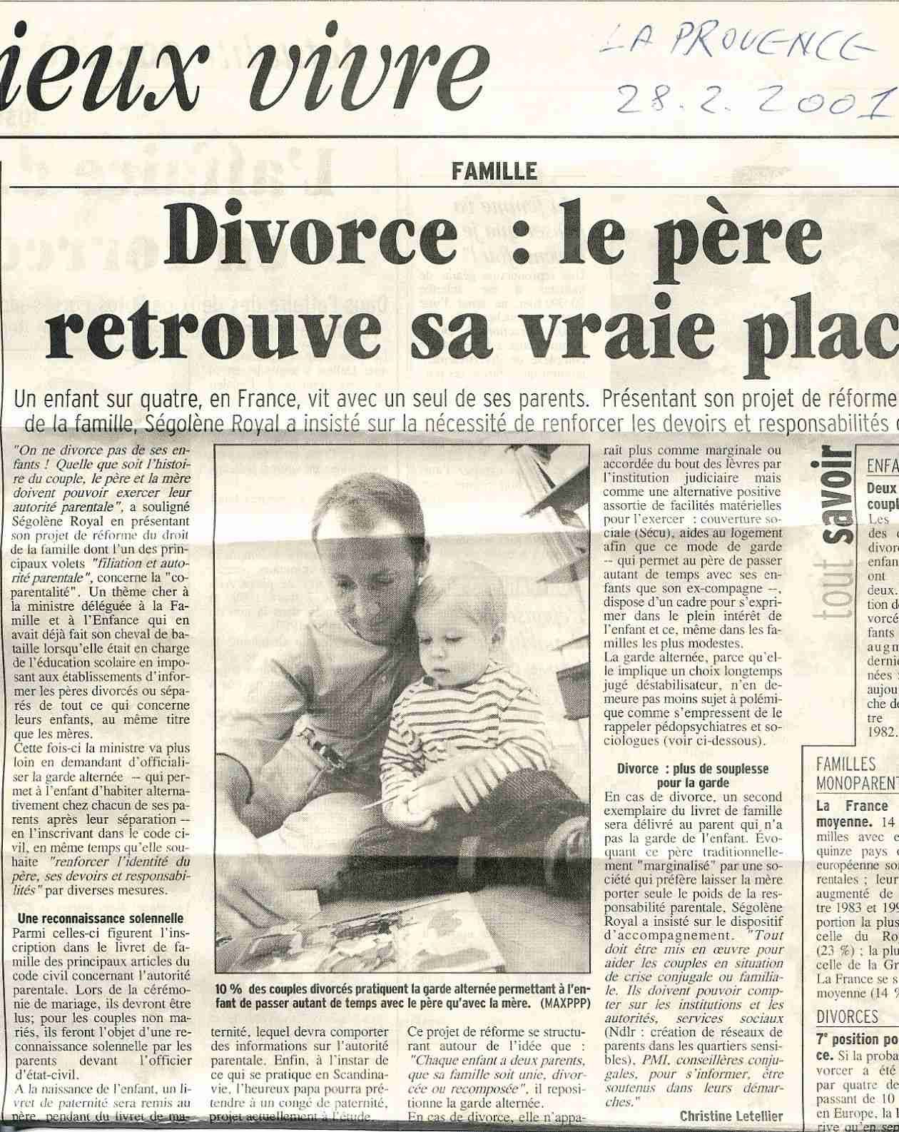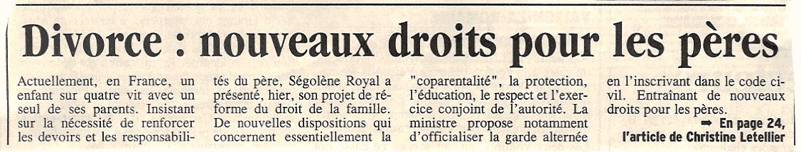 In Frankreich lebt zur Zeit jedes vierte Kind mit nur einem Elternteil zusammen. Ségolène Royal besteht auf der Notwendigkeit, die Pflichten und Verantwortlichkeiten des Vaters zu stärken und hat gestern ihr Reformprojekt für das Familienrecht vorgelegt. Neue Bestimmungen, bei denen es vor allem um "die gemeinsame Elternschaft", den Schutz, die Ausbildung, die Achtung und die gemeinsame Ausübung des Erziehungs- und Sorgerechts geht. Die Ministerin schlägt insbesondere vor, das abwechselnde Sorgerecht durch seine Aufnahme in das Bürgerliche Gesetzbuch amtlich anzuerkennen. Damit sind für die Väter neue Rechte verbunden. Auf Seite 24, Artikel von Christine Letellier 1 französischer Originaltext |