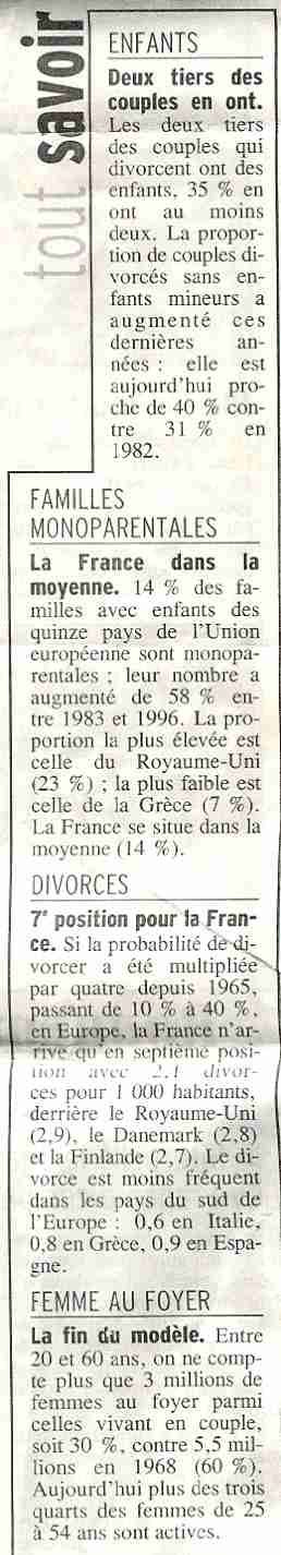 Wissen KINDER Zwei Drittel aller Paare haben Kinder. Zwei Drittel aller Paare, die sich scheiden lassen, haben Kinder, 35% davon mindestens zwei. Der Anteil geschiedener Paare ohne minderjährige Kinder hat in den letzten Jahren zugenommen: er liegt heute bei annähernd 40% gegenüber 31% im Jahr 1982. FAMILIEN MIT NUR EINEM ELTERNTEIL Frankreich in der Mitte. 14% der Familien mit Kindern in den 15 Ländern der Europäischen Union umfassen nur ein Elternteil; ihre Zahl ist zwischen 1983 und 1996 um 58% gestiegen. Den größten Anteil hat Großbritannien (23%), den niedrigsten Griechenland (7%). Frankreich liegt etwa in der Mitte (14%). SCHEIDUNGEN 7. Platz für Frankreich. Wenn sich die Scheidungswahrscheinlichkeit seit 1965 vervierfacht hat und von 10% auf 40% gewachsen ist, liegt Frankreich mit 2,1 Scheidungen pro 1000 Einwohner erst an 7. Stelle hinter Großbritannien (2,9), Dänemark (2,8) und Finnland (2,7). In südeuropäischen Ländern ist die Scheidung seltener: 0,6 in Italien, 0,8 in Griechenland, 0,9 in Spanien. FRAU AM HERD Das Ende des Klischees. Von den 20-60-jährigen Frauen, die mit einem Partner zusammenleben, sind nur 3 Millionen, also 30%, nicht berufstätig, gegenüber 5,5 Millionen 1968 (60%). Heute stehen mehr als drei Viertel der Frauen zwischen 25 und 54 Jahren im Berufsleben. 3 französischer Originaltext |