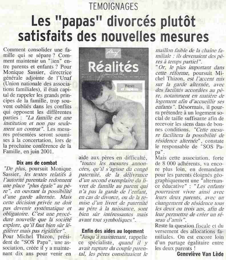 AUSSAGEN Realitäten Geschiedene "Papas" eher zufrieden mit den neuen Maßnahmen Wie kann man eine Familie festigen, die sich trennt? Wie kann man eine "Bindung" zwischen Eltern und Kindern erhalten? Für Monique Sassier, stellvertretende Generaldirektorin der Unaf (Union nationale des associations familiales) war es wesentlich, an die großen Prinzipien der Familie zu erinnern, die allzu oft bei den Konflikten zwischen den verschiedenen Parteien vergessen werden: "Die Familie ist eine Institution und nicht nur ein Vertrag". Die vorgestellten Maßnahmen werden bei der nächsten Familienkonferenz im Juni 2001 zur Abstimmung gebracht werden. Zehn Jahre Kampf "Darüber hinaus, führt Monique Sassier fort, geben die Texte zum elterlichen Erziehungs- und Sorgerecht dem Vater einen "gleichrangigeren" Platz zurück, indem sie die Möglichkeit eines abwechselnden Sorgerechts eröffnen. Diese persönliche Entscheidung darf jedoch nicht systematisch und obligatorisch zu treffen sein. Es ist ein neues Vorgehen, das die Gesellschaft untersucht, und das natürlich gesetzlich geregelt, aber flexibel gehandhabt werden muß". Für Michel Thizon, Vorsitzender von SOS Papa, einem vor mittlerweile zehn Jahren gegründeten Verband, der Vätern in Not zu Hilfe kommen will, sind "alle angekündigten Maßnahmen, ob es sich nun um den Vaterschaftsurlaub, die Ausstellung eines zweiten Exemplars des Familienbuchs für den Elternteil, der bei einer Scheidung nicht das Sorgerecht für das Kind hat, oder die Aushändigung eines Vaterpasses für den Vater bei der Geburt handelt, natürlich interessant, aber vor allem symbolischer Art." Endlich Wohnungsbeihilfen "Bisher war es so," erinnert sich dieser Fachmann, "daß die Väter bei einem Bruch zwischen dem Elternpaar das schwache Glied in der Familienkette darstellten: sie wurden Teilzeitväter". "Das Wichtigste an dieser Reform," fährt Michel Thizon fort, "ist der Schwerpunkt auf dem abwechselnden Sorgerecht, wobei dem Vater insbesondere in Sachen Wohnung Vergünstigungen geboten werden, um seine Kinder aufnehmen zu können". Seither kann er Anspruch auf eine Sozialwohnung ausreichender Größe erheben, um die Seinen unter guten Bedingungen aufzunehmen. "Diese Maßnahme wird die Möglichkeit des wechselnden Wohnsitzes erleichtern," stellt der Verantwortliche von SOS Papa fest. Dieser 8000 Mitglieder starke Verband geht jedoch noch weiter und fordert für Eltern, die geographisch weit von einander entfernt sind, einen "regelmäßigen Bildungswechsel": "Die Kinder könnten so bei ihren beiden Elternteilen leben und alle zwei oder drei Jahre den Wohnsitz wechseln, um sich einen Freundeskreis aufbauen zu können". Bleibt die Frage der Steuern und der Auszahlung von Kindergeld. Wir sind von einer gleichberechtigten Aufteilung zwischen beiden Elternteilen noch weit entfernt! Geneviève Van Lède 4 französischer Originaltext |