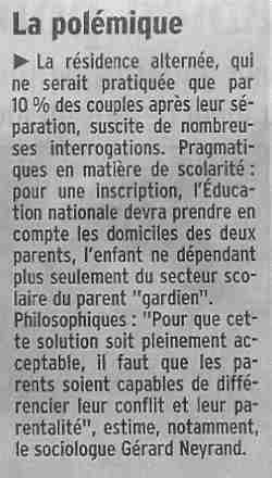 Die Polemik Der wechselnde Wohnsitz, der nur von 10% der Paare nach ihrer Trennung praktiziert werden wird, wirft viele Fragen auf. Pragmatische im Hinblick auf die Schule: für eine Anmeldung muß das nationale Bildungswesen die Wohnsitze beider Elternteile berücksichtigen, da das Kind nicht mehr nur dem Schulsektor des "sorgeberechtigten" Elternteils zugeordnet werden kann. Philosophische: "Damit diese Lösung wirklich akzeptabel wäre, müßten die Eltern zwischen ihrem Konflikt und ihrem Elternsein differenzieren können," urteilt insbesondere der Soziologe Gérard Neyrand. 5 französischer Originaltext |