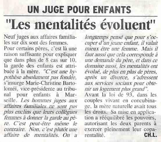 EIN RICHTER FÜR KINDER "Die Mentalitäten ändern sich" Neun von zehn Familienrichtern sind Frauen. Für bestimmte Väter ist das eine hinreichende Begründung für die Tatsache, daß in mehr als 8 von 10 Fällen das Sorgerecht für die Kinder der Mutter zugesprochen wird. "Diese Hypothese entbehrt jeder Grundlage," empört sich Marie-Christine Bartoloméi, Vizepräsidentin am Kindschaftsgericht in Marseille. "Die in Familiensachen tätigen männlichen Richter sind nicht eher bereit als ihre weiblichen Kollegen, dem Vater das Sorgerecht zuzusprechen. Vielleicht trifft sogar eher das Gegenteil zu. Nein, es ist eher eine Frage der Mentalitäten. Man hat lange Zeit angenommen, daß Frauen sich besser um ein Kleinkind kümmern können. Allerdings muß das auch einem Antrag des Vaters entsprechen, und auch in diesem Bereich haben sich die Mentalitäten verändert: immer mehr Väter wenden sich nach einer Scheidung an die Sozialämter, um eine größere Wohnung zu erhalten." Vor dem Gesetz von 93 hatte bei unverheiratet zusammenlebenden Paaren die leibliche Mutter alle Rechte. Die Anwendung des Gesetzes hat die Kräfte wieder ins Gleichgewicht gebracht, denn es ermächtigt beide Elternteile, ihre Mitelternschaft umfassend wahrzunehmen. CH.L. 6 französischer Originaltext |
